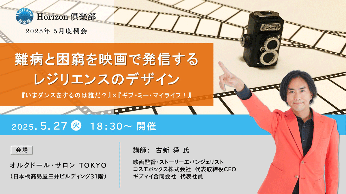 今回は、このレジリエンスを「逆境力」と解釈し、『逆境を人生のリソースへと転換する映画の力』『レジリエンス(逆境力)を高める方法』について、映画監督・ストーリーエバンジェリストの古新舜氏にお話をしていただきます。